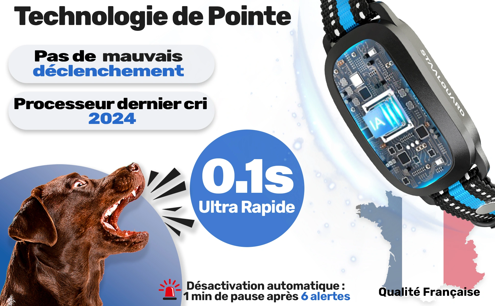 - TECHNOLOGIE IA AVANCÉE : Grâce à sa puce IA, le collier distingue parfaitement les aboiements réels des bruits environnant, éliminant ainsi les déclenchements accidentels. Le collier se désactive temporairement après 6 alertes pour protéger votre chien et éviter une stimulation excessive